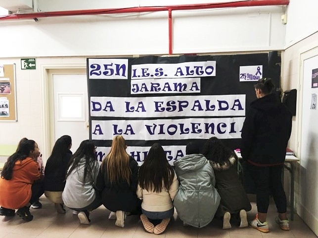 Como parte de esta campaña, se propuso al alumnado la realización de un cartel o pancarta con un mensaje a transmitir sobre la violencia machista. El IES Alto de Jarama en Torrelaguna consensuó un contundente slogan “dar la espalda a la violencia machista” para visibilizar su condena ante cualquier forma de violencia contra las mujeres. Por grupos, se fotografiaron del espaldas al objetivo en una imagen llena de simbolismo. Este fue uno de los resultados.