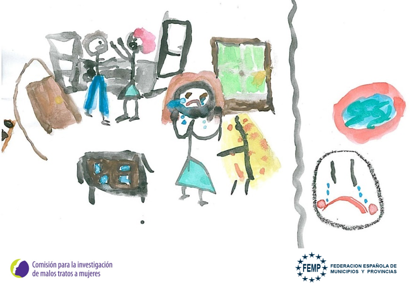 Sobrecoge mirar el dibujo de esta niña de 11 años y comprobar cómo puede reflejarse la tristeza de una forma tan descarnada y dolorosa. La ilustración forma parte de la exposición ‘’Crecer con miedo: niños y niñas ante la violencia de género’’ puesta en marcha por la Comisión para la Investigación de Malos Tratos a Mujeres, en colaboración con la Federación Española de Municipios y Provincias durante el último trimestre del 2019.