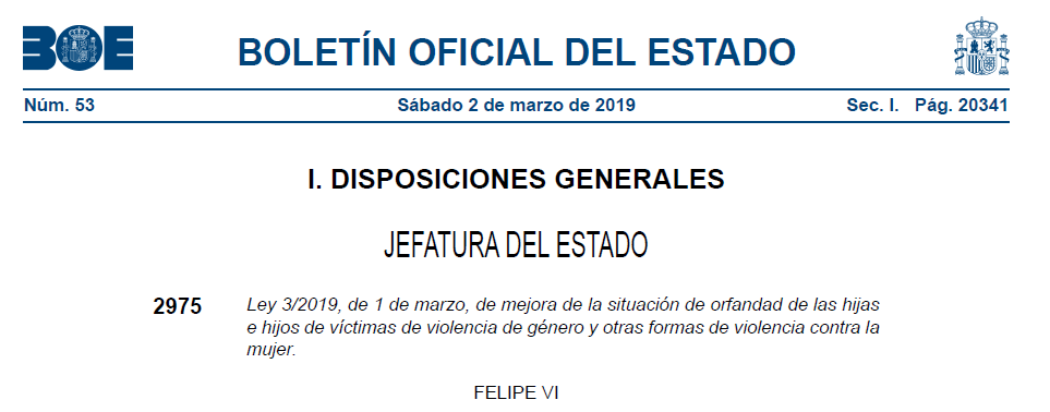 Ley 3/2019, de 1 de marzo, de mejora de la situación de orfandad de las hijas e hijos de víctimas de violencia de género y otras formas de violencia contra la mujer. (Publicada en el BOE el 2/03/2019)